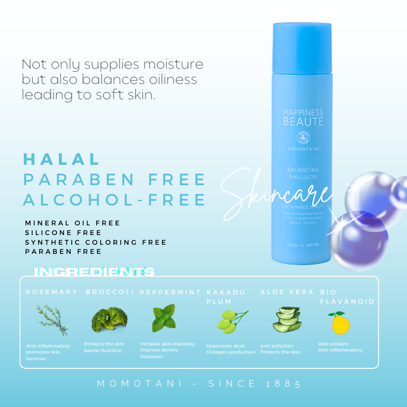• MOMOTANI HAPPINESS BEAUTE BALANCING EMULSION — это легкая, легко наносимая эмульсия для лица, которая быстро впитывается в кожу, оставляя ее мягкой и гладкой. Разработанная для баланса влажности и жирности, наша эмульсия помогает поддерживать красивый, здоровый вид кожи, поддерживая ее упругость и предотвращая сухость и шероховатость.