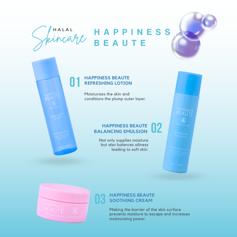 • Полный ассортимент средств по уходу за кожей MOMOTANI HAPPINESS BEAUTE предназначен для совместного использования в качестве пошаговой процедуры для здоровой, сияющей кожи. Наш освежающий лосьон, балансирующая эмульсия и успокаивающий крем работают вместе, обеспечивая комплексное увлажнение, питание и защиту для всех типов кожи.
